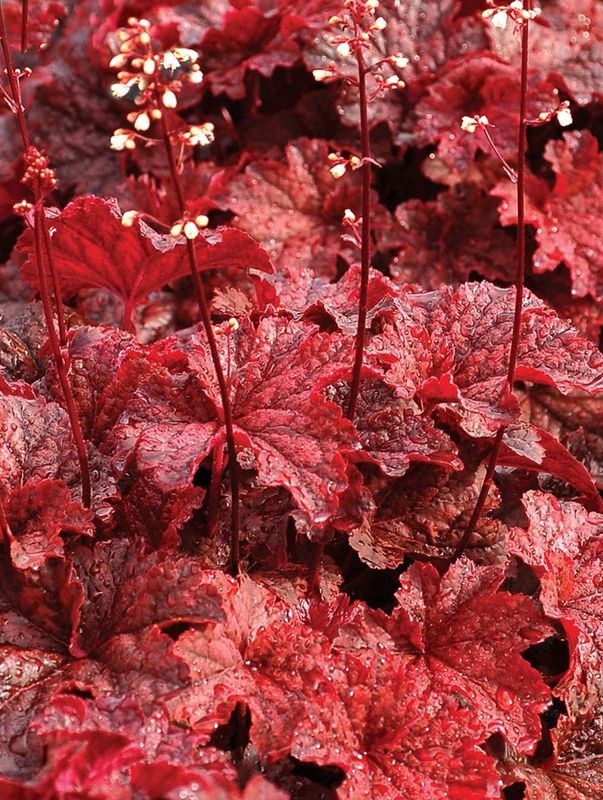 grupa roślin: BYLINYstanowisko: Odmiana żurawki o zmiennym kolorze liści. Wiosną blaszki liściowe rozwijając się zachwycają głębokim czerwonym kolorem, następnie w trakcie trwania sezonu stają się coraz ciemniejsze, prawie czarne by na jesieni nabrać bordowych odcieni. Odmiana bardzo tolerancyjna może rosnąc zarówno w słońcu, półcieniu jak i cieniu, na glebach świeżych, żyznych, przepuszczalnych nie za mokrych zimą. Kwiaty białe , drobne zebrane w luźne wiechy na szczytach ciemnych pędów.