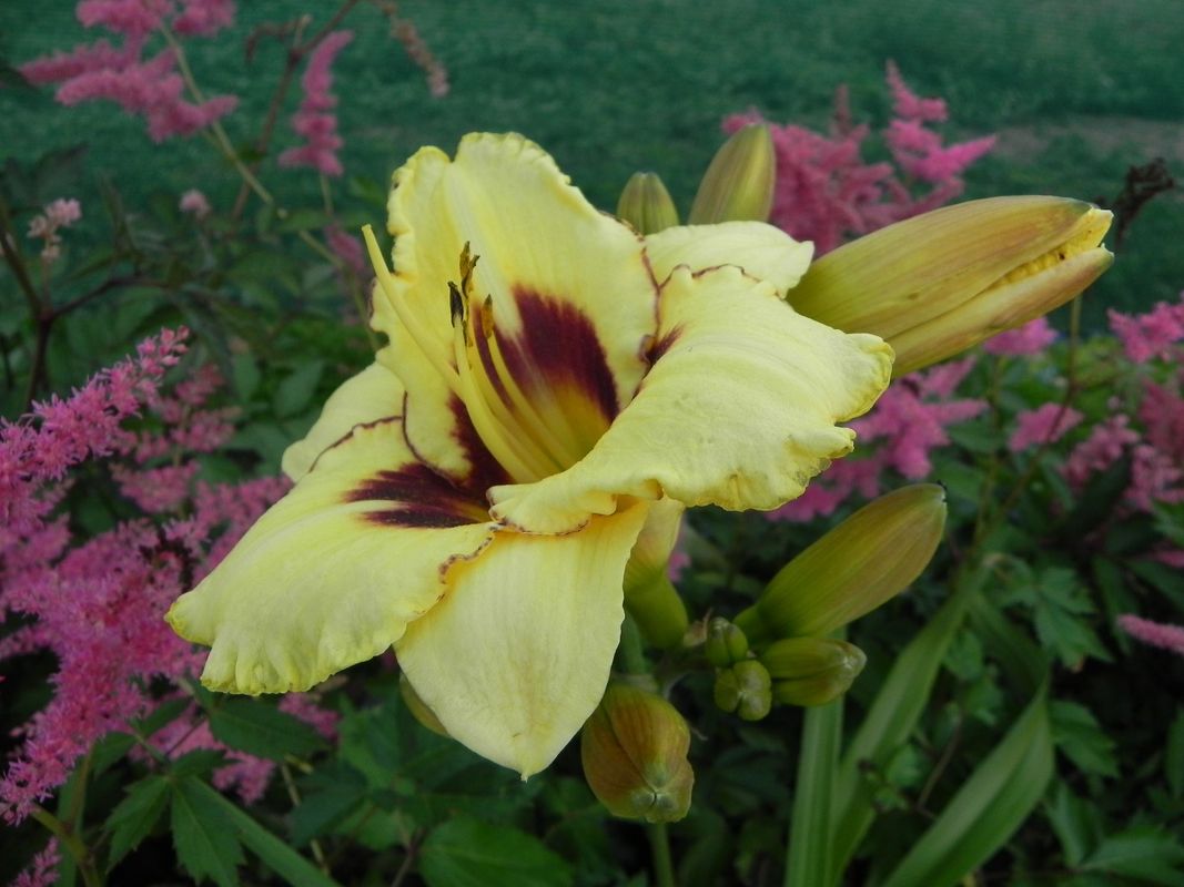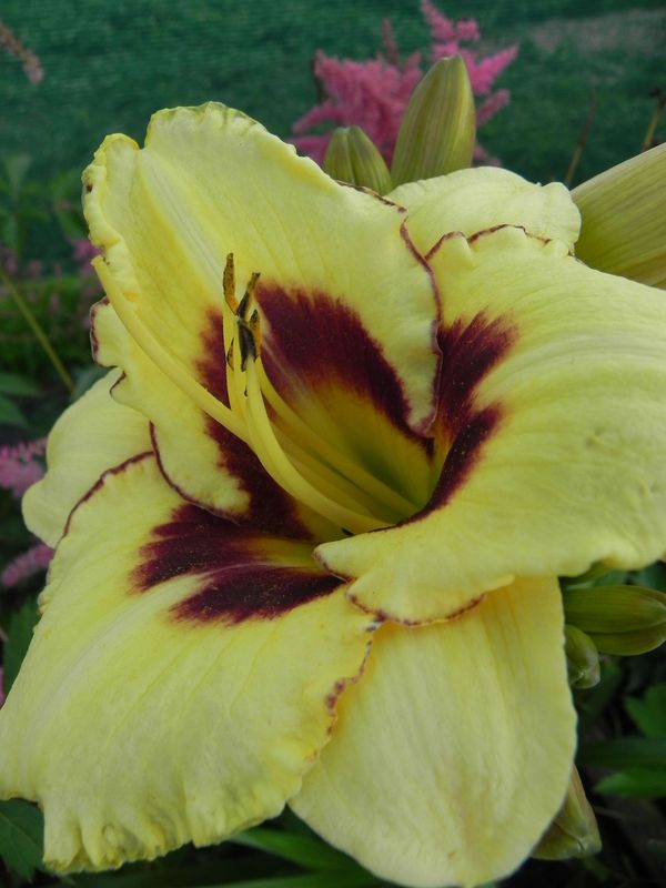 grupa roślin: BYLINYstanowisko: Wysoki, późno kwitnący liliowiec posiadający musztardowe kwiaty z ciemnym fioletowobrązowym okiem i zielonym gardłem. Kwiaty dorastają do 13 cm szerokości. Tworzy szeroką kępę trawiastych liści, które zamierają na zimę. Preferuje stanowiska słoneczne lub półcieniste, gleby przeciętne, umiarkowanie wilgotne. Roślina długowieczna mogąca nawet kilkadziesiąt lat rosnąć w jednym miejscu.