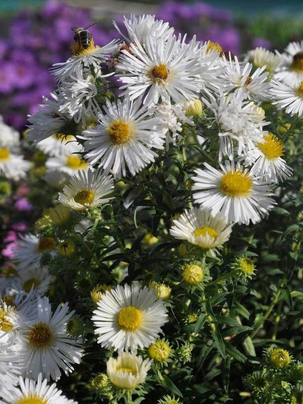 grupa roślin: BYLINYstanowisko: Aster, zwany Marcinkiem, tworzy wysoką, zwężającą się ku dołowi kępę. Posiada miododajne, stokrotkowate kwiaty o białych płatkach i żółtym środku. Roślina preferuje stanowiska słoneczne, umiarkowanie wilgotne o glebach zasobnych w wapń. Cecha naturalną dla wysokich astrów jest zasychanie liści w dolnej części rośliny, dlatego wskazane jest dobieranie takich roślin towarzyszących, aby zasłoniły nieatrakcyjną części rośliny.