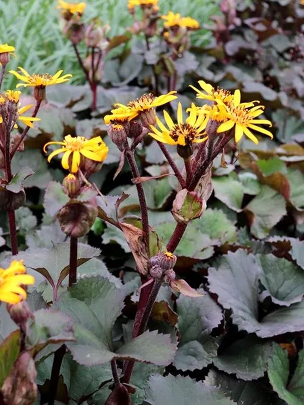 grupa roślin: BYLINYstanowisko: Okazała roślina o dużych skórzastych liściach. Liście zielone z ciemnym, bordoworóżowym spodem, osadzone na długich brązowych ogonkach liściowych. Kwiaty koszyczkowate, pomarańczowożółte wyrastają ponad kępę liści. Zarówno kwiaty jaki liście nadają się do cięcia. Preferuje stanowiska półcieniste i cieniste, gleby żyzne, świeże umiarkowanie wilgotne. Poradzi sobie również w pełnym słońcu o ile będzie miała zapewniony stały dostęp do wody. Bywa atakowana przez ślimaki.